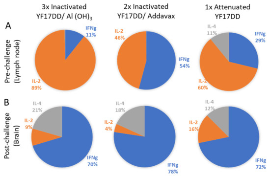 Cytokine balance in the local response (draining lymph nodes and brain) at pre- (A) and post-challenge (B) times. Sectoral graphs show the contribution of each cytokine to the response induced by each vaccine.
