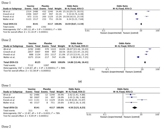 If possible, data were pooled and analysis undertaken using the Review Manager tool Version 5.4.1, The Cochrane Collaboration, 2020. Odds ratios and 95% confidence intervals (CI) were calculated when data were available in at least 3 separate studies for outcomes in studies of the same vaccine using the Mantel–Haenszel method.