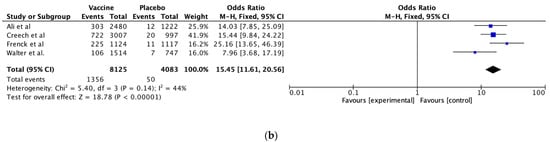 (a) Forest plots comparing injection-site pain in participants receiving mRNA vaccines compared with placebos after Dose 1 and Dose 2 [24,26,31,33]. (b) Forest plots comparing fever in participants receiving mRNA vaccines compared with placebos after Dose 1 and Dose 2 [24,26,31,33].
