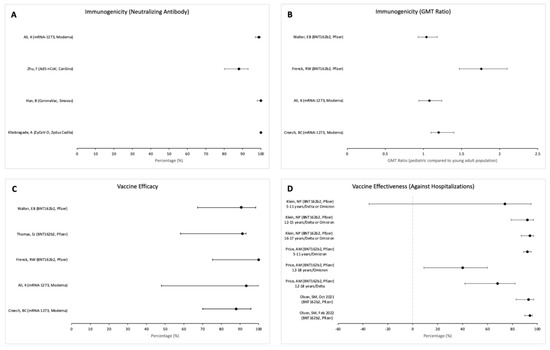 Forest plots describing (A) percent of the paediatric study population showing seroconversion of neutralising antibodies after the primary COVID-19 vaccine series [25,26,29,32], (B) geometric mean titre (GMT) ratio of paediatric study population compared with young adult population [24,26,31,33], (C) vaccine efficacy in paediatric COVID-19 vaccine clinical trials [24,26,27,31,33], and (D) vaccine effectiveness against COVID-19-related hospitalizations [35,40,41].