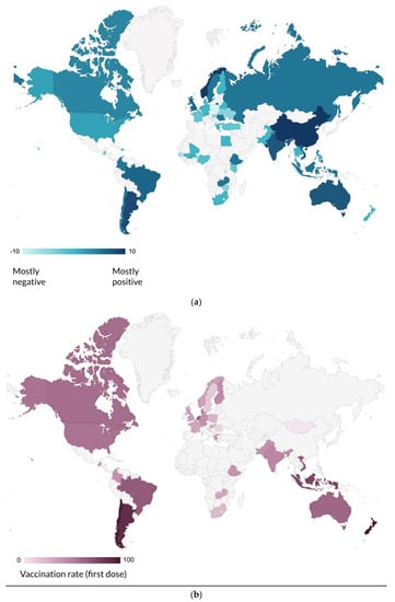 (a) Global maps depicting reported public attitude towards vaccinating children against COVID-19 and vaccination rates, April–June, 2022. (b) The reported vaccination rate of age-eligible children having received at least one vaccine dose.