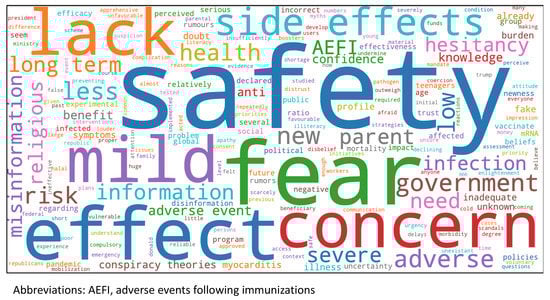 An open-ended question was posed to respondents about their perceived major reasons for COVID-19 vaccine hesitancy in their country. The responses were reviewed to extract themes using directed content analysis [21]. The codebook was created after a primary search of the literature of the concepts and causes of vaccine hesitancy. Two coders (HL and DP) were used to establish trustworthiness of the qualitative findings [22]; they met to review and consolidate coding and reconcile any differences. Coding disputes were resolved through discussion with the co-author (PSP). A visual representation of the text that appeared more frequently was generated using Python 3.9.