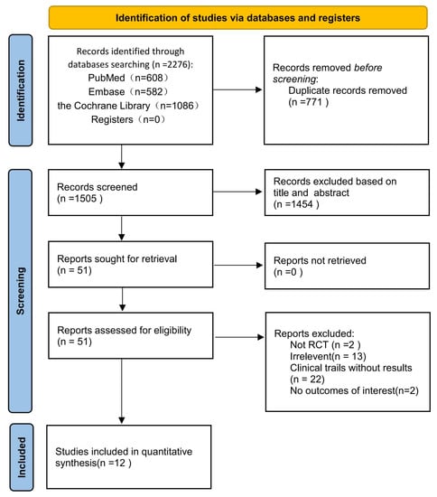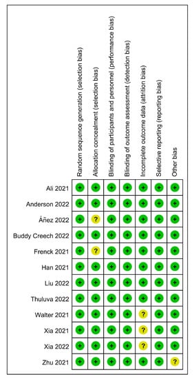 As shown in the flow diagram in Figure 1, this study found 2276 research articles using the previously mentioned search terms. After removing duplicates, we screened 1505 records based on title and abstract, of which 1454 were determined to be irrelevant. Fifty-one articles were retrieved for full-text assessment. Finally, 12 articles were included in our analysis: 12 articles for safety, seven for immunogenicity, and five for the efficacy of COVID-19 vaccines. These 12 RCTs included four types of COVID-19 vaccines (mRNA, subunit, inactivated, and adenoviral vector vaccines). All included studies reported COVID-19 vaccines from eight countries and regions; a total of 17,731 participants that received the COVID-19 vaccine and 7444 participants who received a placebo were included in this study ranging in age from six months to 17 years old. Frenck et al. and Walter et al. did not provide the exact number of participants in the vaccine group and placebo group in the safety analysis, so we obtained the available data by calculating the product using the form of totals and percentages. Notably, two RCTs [,] received a total of three doses. The characteristics of the included studies are summarized in Table 2. We performed the quality assessment for those included studies, the methodological quality of the included studies was high, and the risk of bias was low. Incomplete data and other biases dominated those bias risks. In three studies, incomplete data due to a lack of reasons for exclusive participants during the experiment, two did not specify the method of concealment allocation, and one included a small number of participants, as shown in detail in Figure 2 and Figure 3. Since there were slight differences in outcome indicators among the included studies, this analysis tested publication bias through seven RCTs. Publication bias was performed by funnel plot and Egger’s test, and the results did not show evidence of publication bias in total, systemic, or local adverse reactions (p < 0.05) (Figures S1 and S2) but did show in the neutralizing antibody 28 days after dose 2 (p < 0.05) (Figure S3).