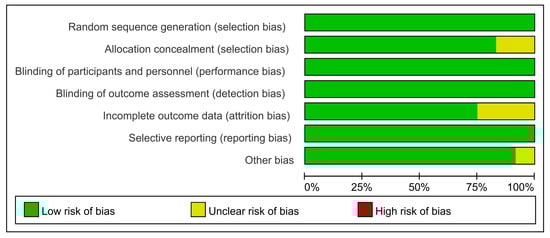 Risk of bias summary for included RCTs (the green color and special symbol “+” are represented a low risk of bias, and the yellow color and special symbol “?” are represented an unclear risk of bias).