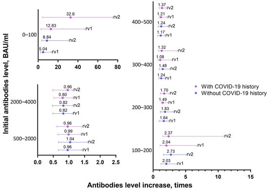 3.3. Immunological Effectiveness of Vaccination with Sputnik V Depending on the Initial Level of Antibodies before Revaccination