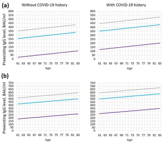| Medium initial level of IgG to RBD | 200–300, n = 295 | 67 (62–75) | 394 (236–583) | 435 (275.5–777) | p12 < 0.001 * p13 < 0.001 * p23 = 0.008 * | 1.64 (0.93–2.401) | 1.83 (1.10–3.14) |