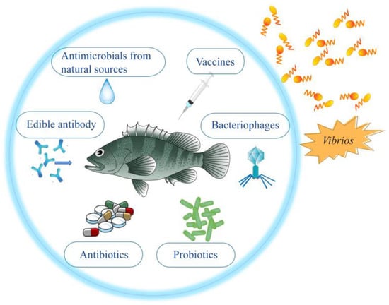 Control of V. anguillarum is usually carried out through the application of water quality management, vaccines, antibiotics and probiotics [43]. The other preventative and treatment procedures may not be as effective as vaccination in high-quality aquaculture but are still indispensable in maintaining fish production and economic status.
