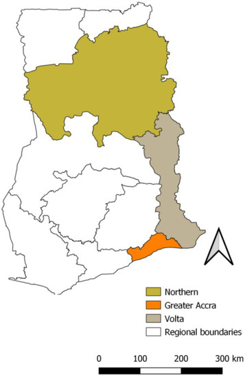 Map of Ghana showing the location of the Greater Accra, Northern, and Volta regions based on administrative boundaries from 2018.