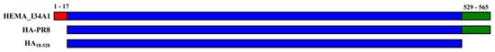 The hemagglutinin extracellular domain, HA18–528, was derived from full-length hemagglutinin, HA-PR8, of influenza A/Puerto Rico/8/1934 H1N1 by the deletion of amino acids from 529 to 565, corresponding with the transmembrane and cytoplasmic domains. HEMA_I34A1 corresponds to the full amino acid sequence of hemagglutinin in influenza A/Puerto Rico/8/1934 H1N1.