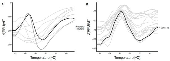 Screening for best refolding and dialysis conditions for HA18–528 using differential scanning fluorimetry. (A) The first screening round identified Buffers 2 and 3 (black and dark gray curves) as suitable for promoting refolding. (B)—Third screening round showing selected dialysis condition Buffer 18 (black curve). Thin, light gray curves in both figures represent data for other tested conditions.