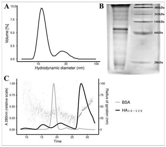 Supramolecular HA18–528 protein assembly. (A)—DLS particle size analysis of a 0.5 mg/mL HA18–528 protein solution. (B)—BN-PAGE of 30 μg HA18–528 on a 10—20% gradient Bis-Tris gel; Lane 1—HA18–528; Lane 2—NativeMark™ Unstained Protein Standard. (C)—FFF-MALS analysis of HA18–528; black line—HA18–528; gray line—BSA control; dots—radius of gyration calculated for HA18–528; separation under a 4 mL/min constant crossflow until t = 26 min, reduced to 0 mL/min (linear gradient, 1 min) at t = 27 min, and held constant until t = 32.5 min.