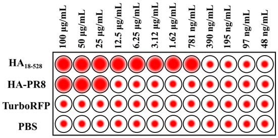 Recombinant HA18–528 and HA-PR8 were diluted with 1× phosphate buffer saline (PBS) to a concentration of 200 μg/mL. 50 μL of protein solution was added to a U-shaped cell culture plate and serially diluted two-fold along the plate; afterwards, 50 μL of 0.5% turkey red blood cells (RBC) in PBS was added to each well. PBS alone and recombinant TurboRFP were used as negative controls. After 30 min of incubation at room temperature, agglutination was assessed.