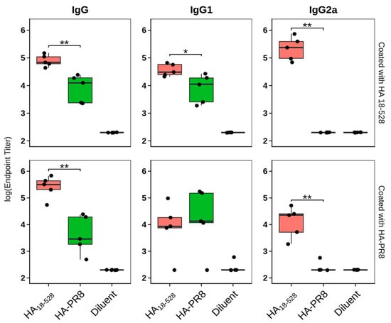 Specific antibodies in mouse serum were detected and quantified by end-point titration using an enzyme-linked immunosorbent assay (ELISA). Briefly, 384-well micro-titer plates (Nunc) were coated with 0.5 μg/mL of HA18–528 or HA-PR8 diluted in PBS and incubated overnight at 4 °C. The unreacted sites were blocked with 1% bovine serum albumin (BSA) in PBS for 2 h at room temperature (RT). Plates were washed three times with 0.05% Tween-80 in PBS, followed by the addition of serum samples. Sera obtained from sham mice served as a negative control. Individual serum samples were serially diluted from 1:200 to 1:6400 in 1% BSA and 0.05% Tween-80 in PBS. One pool of sera from antigen immunization at 42 days was also added in serial dilution from 1:50 to 1:102,400 to normalize results. After washing three times, goat anti-mouse IgG, IgG1, and IgG2a—HRP conjugated antibodies (SouthernBiotech, Birmingham, AL, USA), respectively, were added at appropriate dilutions to different assay plates. Following 1 h of incubation at RT and three washes, TMB (TetraMethylBenzidine) peroxidase substrate (- ThermoFischer Scientific, Waltham, MA, USA) was added to the wells. After color development, the reaction was stopped by the addition of 2N H2SO4, and the absorbance was measured at 450 nm (ThermoScientific Multiskan FC instrument). Analysis was performed in Rstudio version 1.2.5033 using a 4-parameter logistic curve with nplr (n-parameter logistic regression) and calibFit R packages and was represented as box plots using the ggplot2 package []. Results were expressed as endpoint titers, defined as the reciprocal sample dilution that would result in three times the baseline + standard error, as derived from the internal standard curve by multiplication. Each mouse serum sample was tested separately, in triplicate.