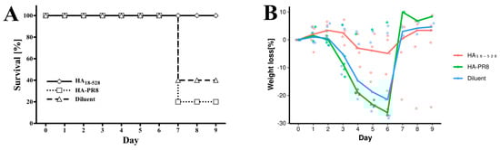 Survival and weight loss of immunized mice when challenged with the mouse-adapted influenza virus A/Puerto Rico/8/1934 H1N1. Mice were split into three groups that received a two-dose immunization (3 μg each) with HA18–528, HA-PR8, or diluent. (A)—survival curves, log-rank p = 0.05 HA18–528 group vs. diluent controls, p = 0.01 HA18–528 group vs. HA-PR8 group; (B)—weight loss calculated as % from day 0. Dots represent each individual measurements.