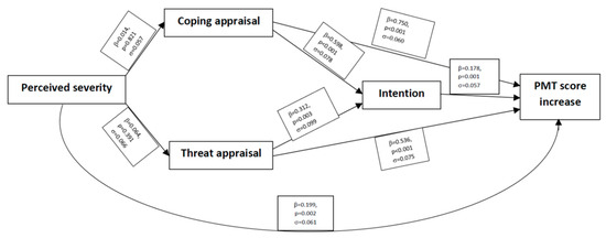The results of the path analysis (Figure 2) showed that coping appraisal is the most powerful predictor of the protecting motivation, with β = 0.750 on PMT score increase, followed by coping appraisal β = 0.598 on intention and threat appraisal, β = 0.536 on PMT score increase.