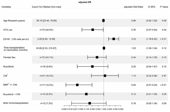 Further, it was observed that ruxolitinib when administered alone did not show a significant influence on the vaccination success, with an aOR of 0.25 (CI 95% [0.04–1.67], p = 0.15). However, there was a trend in the multivariable analysis when ruxolitinib was combined with calcineurin inhibitors, hinting towards a negative impact on vaccination outcomes with this combination, with an aOR of 0.12 (CI 95% [0.01–1.00], p = 0.05).