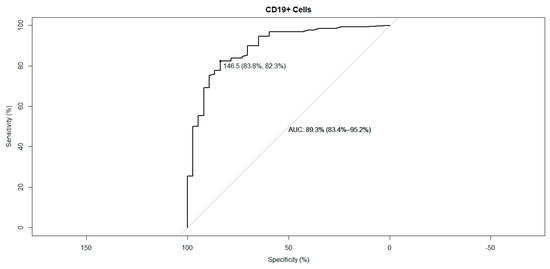However, only the CD19+ B cell count remained a significant variable in the multivariate model. Here, the likelihood of a humoral response to vaccination was found to be associated with a higher CD19-positive cell count. For every increase of 100 CD19-positive cell/μL, the aOR for a humoral vaccination response was 3.3 (CI 95% [1.78–6.20], p < 0.001). This observation underscores the pivotal role of B-cells in mediating a robust humoral response to vaccination. Upon conducting an ROC analysis, a threshold of 146.5 cells/μL yielded an area under the curve (AUC) of 89.3% (CI 95% [83.4–95.2%]; Figure 2).
