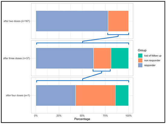 Illustration of humoral responses to mRNA vaccinations. The chart categorizes individuals as responders (purple), non-responders (orange), and those lost to follow-up (green; e.g., those declining further vaccinations). The data are segmented into three bar charts representing the number of vaccination doses received. Notably, after each dose, only non-responders are charted for subsequent doses to evaluate their responsiveness.