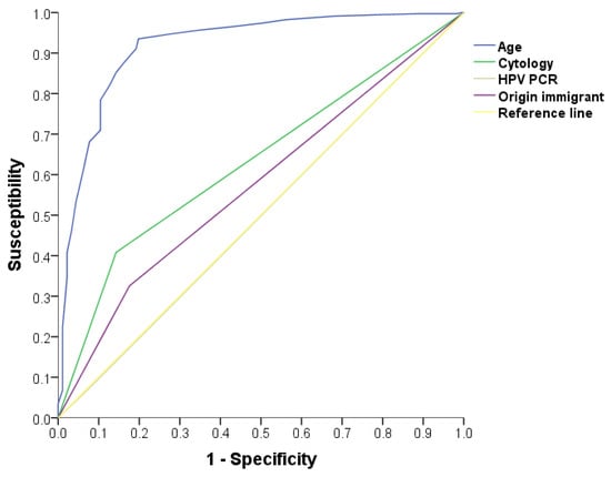 Regarding the ROC curve analysis (Figure 1), the variable age exhibited an area under the curve (AUC) of 0.917 (95% CI 0.89–0.94), indicating strong discriminatory power; immigrant origin, 0.575 (95% CI 0.52–0.62); cervical cytology performed, 0.633 (95% CI 0.52–0.62); and HPV PCR performed, 0.498 (95% CI: 0.44–0.55).