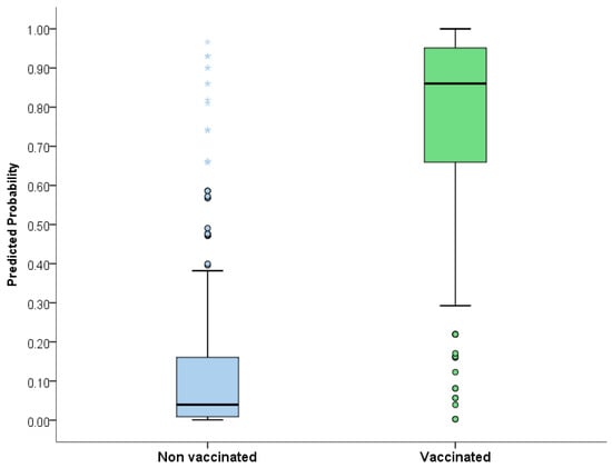 The kappa concordance methodology showed good results, with a Kappa index of 0.755, sensibility of 0.81 (95% CI 0.75–0.86), specificity of 0.93 (95% CI 0.91–0.96), positive predictive value of 0.87 (95% CI 0.82–0.92), and negative predictive value of 0.90 (95% CI 0.87–0.93). Figure 2 shows the probability distribution of the forecast from the logistic regression model.
