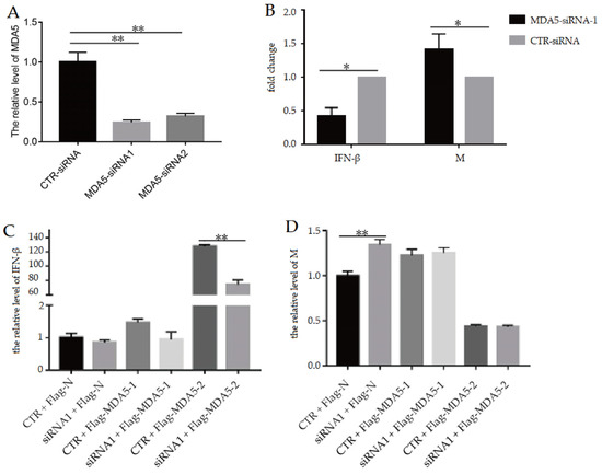 For RNA interference experiments, two pairs of interfering primers were designed against the MDA5 genes, as shown in Table 1. About 80% filled DF-1 cells were transiently transfected with 100 μmol/L MDA5-siRNA1/2 and CTR-siRNA using the Lipofectamine® 3000 (Thermo Fisher Scientific, Waltham, MA, USA) transfection reagent. At 36 h post-transfection, the levels of MDA5, β-IFN, and viral M gene were detected via RT-qPCR (TaKaRa, Beijing, China).