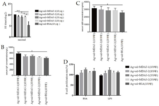 Antibody levels in the recombinant protein immunization group. (A) HI antibody level. The inactivated vaccines containing the purified recombinant were thoroughly mixed with white oil adjuvant. Chickens were immunized with the prepared vaccines mixed with H9N2 antigen plus recombinant MDA5-1 and MDA5-2 proteins and white oil adjuvant, and HI antibody titer was detected on the 14th day after the second immunization. (B) IgY level in chicken serum after the third immunization. (C) IgM level in chicken serum after the third immunization. (D) The proliferative activity of chicken lymphocytes. * p < 0.05; ** p < 0.01.