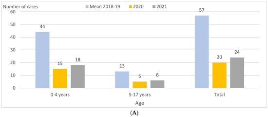 IPD incidence was 11.0 and 4.6 per 100,000 PY in 2018–2019 and 2021, respectively, representing a decrease of 58% (p < 0.001) overall, focused especially in the 0–4 age group (−56%; p = 0.002) (Table 1; Figure 1A). In the first quarters, reductions were 88% (p < 0.001) (Table 2). In 2021, compared to 2020, IPD incidence overall was broadly the same (4.6 and 3.8 per 100,000 PY, respectively), but decreased significantly in the first quarter, from 2.9 to 0.4 per 100,000 PY (−86%; p < 0.001) and increased in the second quarter, from 0.0 to 1.2 per 100,000 PY (p = 0.02) (Table 1 and Table 2; Figure 1B).