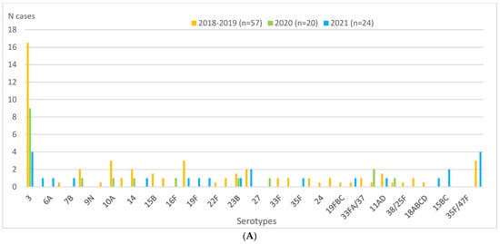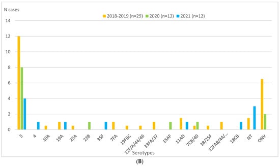 During the entire study period, half or more of IPD cases were diagnosed exclusively by PCR: 50.0% (29/57) in the 2018–2019 pre-pandemic period, 65% (13/20) in 2020, and 50.0% (12/24) in 2021 (Table 3). The most frequent serotype throughout the period was serotype 3, representing 29.8%, 45%, and 16.7% of cases in 2018–2019, 2020, and 2021, respectively (Table 1 and Figure 2A). Serotype 3 was exclusively diagnosed by PCR in 70.6% (12/17), 88.9% (8/9), and 100% (4/4) of cases in 2018–2019, 2020, and 2021, respectively (Figure 2A,B).