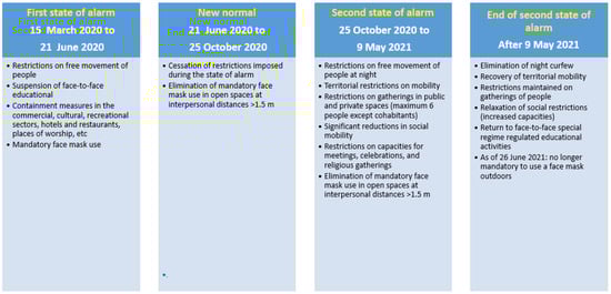 Restrictions and other public health measures imposed due to the COVID pandemic during the study period. First state of alarm [9], New Normal [10], Second state of alarm [11,12], End of de second state of alarm [13].