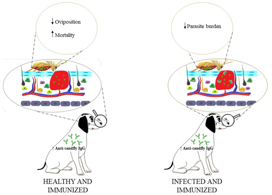Although commercially available vaccines for use in dogs lead to protective immune responses, there is still an important bottleneck in demonstrating the effectiveness in preventing parasitic transmission to the vector. Therefore, new strategies are required to control the vector and the transmission of the parasite, obtaining an effective reduction in the number of cases of canine and human disease. In this sense, the development of TBVs for dogs using antigens from the vector could be an important strategy for controlling the spread of VL, given that the antibodies produced in the vaccinated dog could prevent parasite development in the vector. Notably, important physiological events occur after sandfly blood meals interfering with the host immune system effector mechanisms such as complement activation [78]. The result is the establishment of Leishmania infection in the host, demonstrating its importance for parasite survival. In this context, the induction of specific antibody production in the host could contribute to reduce the parasite’s persistence in the sandfly [56].