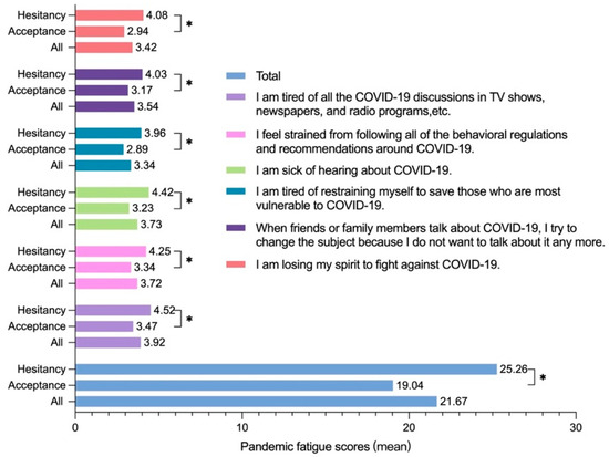 As is shown in Figure 1, the average score of 2942 participants in PFS was 21.67 ± 8.86. The vaccine-hesitant group obtained a fatigue score of 25.26 ± 8.52, while that of the vaccine-accepting group was 19.04 ± 8.17. Disparities between the two groups were statistically significant (p < 0.05), including three information fatigue items and three behavioral fatigue items. The scores of six items in the vaccine-hesitant group were all significantly higher than those in the vaccine-accepting group.