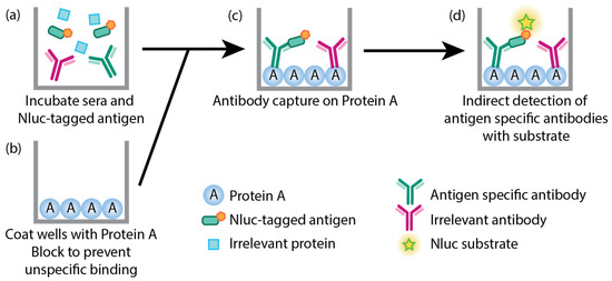 Schematic of modified LACA developed to study ASFV antigen-specific antibody responses of immunized and challenged animals. (a) Sera samples are incubated with cell lysates containing a mixture of specific Nluc-tagged ASFV proteins of interest and irrelevant proteins. (b) Plates are coated with protein A and blocked to prevent unspecific binding. (c) Nluc-tagged antigens bound to their respective antibodies are then captured on protein A, and (d) the presence of antigen-binding antibodies is indirectly measured through the Nluc activity. Irrelevant antibodies bound to protein A are not detected since these do not bind the Nluc-tagged antigens.