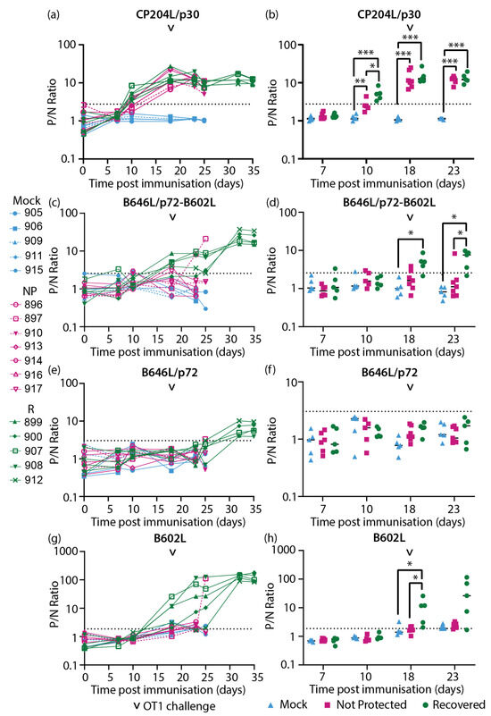 Longitudinal antibody responses of inbred Babraham animals to ASFV recombinant proteins (a,b) CP204L/p30, (c,d) B646L/p72 co-expressed with chaperone B602L, (e,f) B646L/p72, and (g,h) B602L chaperone detected with antigen-specific LACAs at selected days post-immunization (dpi). (a,c,e,g) Antigen-specific antibody kinetics of each animal are plotted. (b,d,f,h) Antibody responses consolidated as a group at each relevant time point are plotted. Only time points where there were four data sets or more were included in this analysis. Lines indicate the mean. Each data point corresponds to a single animal. The point of challenge with virulent OURT88/1 (OT1, 18 dpi) is denoted by the arrowhead in each graph. P/N Ratio: ratio of luciferase activity of each sample to the luciferase activity of the negative control. Dashed line indicates the cutoff determined from the mean and 3x standard deviation of all negative sera samples in each experiment. Blue, Mock: mock control animals immunized with PBS, Pink, NP: OURT88/3 immunized animals that were not protected from OURT88/1, Green, R: OURT88/3 immunized animals that recovered from OURT88/1. * p < 0.05, ** p < 0.01, *** p < 0.005, mixed effects model.