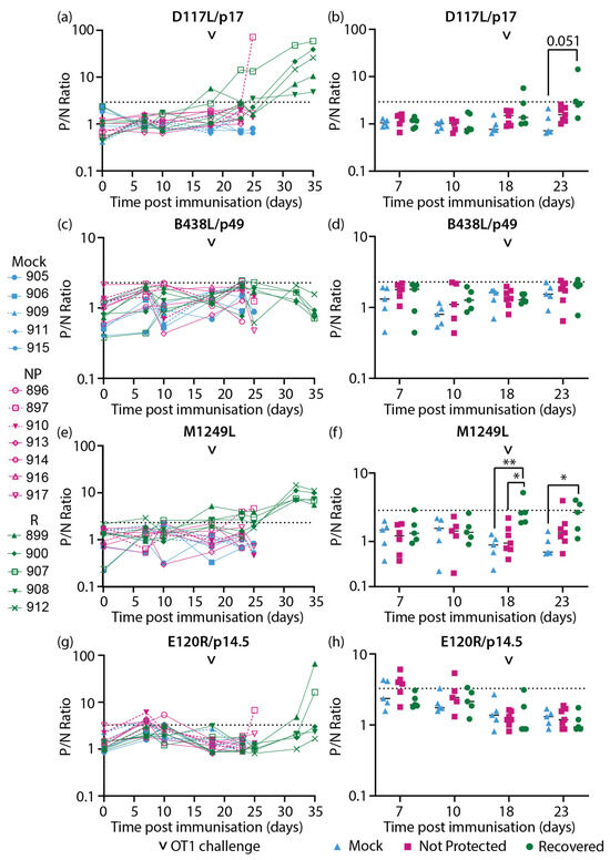 Longitudinal antibody responses of inbred Babraham pigs to ASFV recombinant capsid proteins (a,b) D117L/p17, (c,d) B438L/p49, (e,f) M1249L, and (g,h) E120R/p14.5 detected with antigen-specific LACAs at selected dpi. (a,c,e,g) Antigen-specific antibody kinetics of each animal are plotted. (b,d,f,h) Antibody responses consolidated as a group at each relevant time point are plotted. Only time points where there were four data points or more were included in this analysis. Lines indicate the mean. Each data point corresponds to a single animal. The point of challenge with virulent OURT88/1 (OT1, 18 dpi) is denoted by the arrowhead in each graph. P/N Ratio: ratio of luciferase activity of each sample to the luciferase activity of the negative control. Dashed line indicates the cutoff determined from the mean and 3 × standard deviation of all negative sera samples in each experiment. Blue, Mock: mock control animals immunized with PBS, Pink, NP: OURT88/3 immunized animals that were not protected from OURT88/1, Green, R: OURT88/3 immunized animals that recovered from OURT88/1. * p < 0.05, ** p < 0.01, mixed effects model.