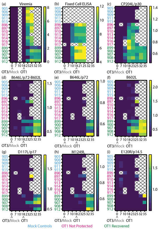 Heatmaps of the virological and immunological parameters of inbred Babraham animals. (a,b) Data reported previously [50], (a) viremia, (b) anti-ASFV antibody titer as determined by fixed-cell ELISA on BA71V-infected Vero cells [50], and (c–i) recombinant ASFV protein-specific LACAs targeting (c) CP204L/p30, (d) B646L/p72 co-expressed with B602L chaperone, (e) B646L/p72, (f) B602L chaperone, (g) D117L/p17, (h) M1249L, and (i) E120R/p14.5. Data plotted as (a) Log10 genome copy numbers/mL, (b) Log2 antibody titer, and (c–i) Log10 of P/N ratio. Each row denotes the responses of a single animal. The negative cutoff for each protein-specific LACA was determined from the mean and 3x standard deviation of all negative sera samples in each experiment. Animal numbers are indicated on the y-axis and the time post-immunization is denoted on the x-axis. Crosses indicate samples that were not available for analysis. Arrowheads denote the immunization and ASFV challenge time points. Blue, Mock: mock control animals immunized with PBS, Pink, NP: OURT88/3 immunized animals that were not protected from OURT88/1, Green, R: OURT88/3 immunized animals that recovered from OURT88/1.