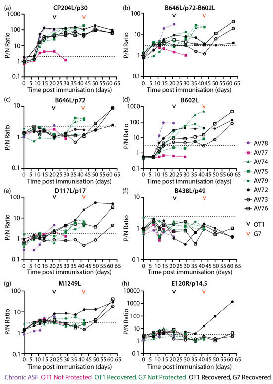 Longitudinal antibody responses of outbred domestic pigs to ASFV recombinant proteins (a) CP204L/p30, (b) B646L/p72 co-expressed with chaperone B602L, (c) B646L/p72, (d) B602L chaperone, (e) D117L/p17, (f) B438L/p49, (g) M1249L, and (h) E120R/p14.5 detected with protein-specific LACAs at selected dpi. Antigen-specific antibody kinetics of each animal are plotted. Each data point corresponds to a single animal. The point of challenge with virulent OURT88/1 (OT1, 21 dpi) and virulent Georgia 2007/1 (G7, 42 dpi) is denoted by the black and orange arrowheads, respectively. P/N Ratio: ratio of luciferase activity of each sample to the luciferase activity of the negative control. Dashed line indicates the cutoff determined from the mean and 3x standard deviation of all negative sera samples in each experiment. Purple: OURT88/3 immunized animal that suffered from chronic ASF, Pink: OURT88/3 immunized animal that was not protected from OURT88/1, Green: OURT88/3 immunized animals that recovered from OURT88/1, but were not protected from Georgia 2007/1, Black: OURT88/3 immunized animals that recovered from OURT88/1 and Georgia 2007/1.