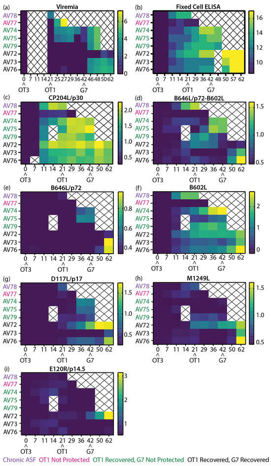 Heatmaps of the virological and immunological parameters of outbred domestic animals. (a,b) Data collected in previous study [50], (a) viremia, (b) anti-ASFV antibody titer as determined by fixed-cell ELISA on BA71V infected Vero cells [50], and (c–i) recombinant ASFV protein-specific LACAs targeting (c) CP204L/p30, (d) B646L/p72 co-expressed with B602L chaperone, (e) B646L/p72, (f) B602L chaperone, (g) D117L/p17, (h) M1249L, and (i) E120R/p14.5. Data plotted as (a) Log10 genome copy numbers/mL, (b) Log2 antibody titer, and (c–i) Log10 of P/N ratio. Each row denotes the responses of a single animal. The negative cutoff for each protein-specific LACA was determined from the mean and 3x standard deviation of all negative sera samples in each experiment. Animal numbers are indicated on the y-axis and the time post-immunization is denoted on the x-axis. Crosses indicate samples that were not available for analysis. Arrowheads denote the immunization and ASFV challenge time points. Purple: OURT88/3 immunized animals that suffered from chronic ASF; Pink: OURT88/3 immunized animals that were not protected from OURT88/1; Green: OURT88/3 immunized animals that recovered from OURT88/1 but were not protected from Georgia 2007/1; Black: OURT88/3 immunized animals that recovered from OURT88/1 and Georgia 2007/1.