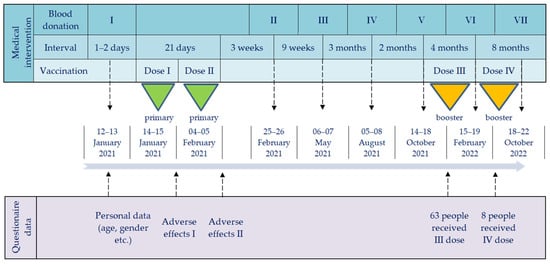 Timeline of vaccine administrations, blood donation checkpoints, and conducted questionnaires. Abbreviations: Roman numerals (I–VII) and arrows, subsequent blood and data collections; green triangles, primary vaccination; orange triangles, booster doses.
