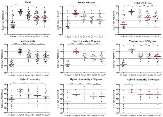 Kinetics of IgA-S1 antibodies in relevant study cohorts. Abbreviations: ns p-Value > 0.05; * p-Value ≤ 0.05; ** p-Value ≤ 0.01; *** p-Value ≤ 0.001; **** p-Value ≤ 0.0001; ns, not significant.. Results obtained for individual patients are represented by dots. Red lines indicate median values.