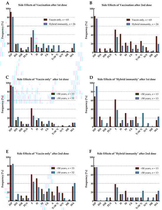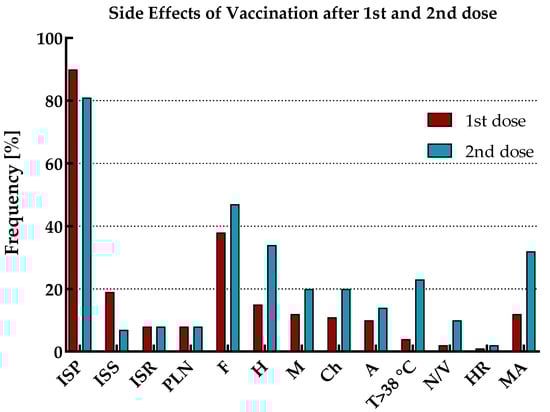 The reported side effects of vaccination (SEV) included injection site pain (ISP), injection site swelling (ISS), injection site redness (ISR), pain/enlargement of lymph nodes (PLN), fatigue (F), headache (H), myalgia (M), chills (Ch), arthralgia (A), temperature over 38 °C (T > 38 °C), nausea or vomiting (N/V), and hypersensitivity reaction (HR). The prevalence of SEV with mean duration and declaration of medication admission (MA) for the total cohort and by immune status (including the age range of study participants), separately for the first and second vaccine doses, is shown in Figure 4 and Figure 5 and Table 5.