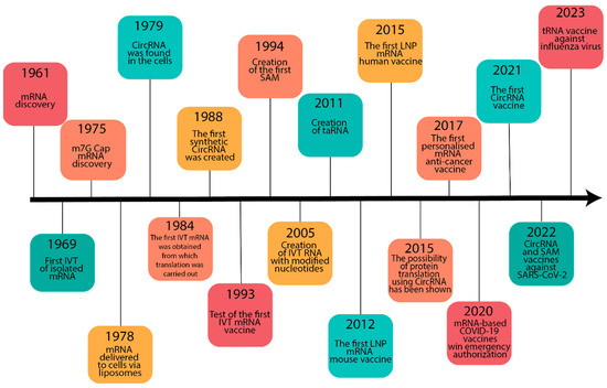 mRNA, as a ribonucleotide template for protein synthesis transcribed from DNA, was initially discovered in 1961 (Figure 1). However, it took several decades of scientific discoveries and experimental investigations before it was used as a vaccine [10].
