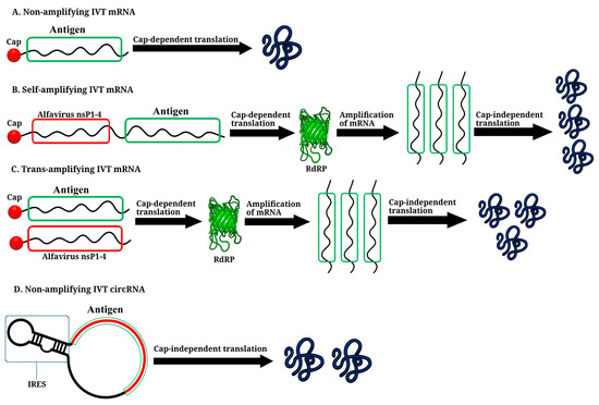 Vaccine design for non-amplifying, self-amplifying, trans-amplifying, and circular in vitro-transcribed RNA (IVT circRNA). Non-amplifying IVT mRNA is the classic RNA vaccine (A). A self-replicating RNA vaccine was created on the basis of non-amplifying IVT mRNA by encoding viral RNA-dependent RNA polymerase (RdRp) (B). The trans-amplifying IVT mRNA vaccine was the logical extension of self-amplifying IVT mRNA. It includes two types of mRNA: mRNA encoding antigens and mRNA encoding viral replicase (С). Circular IVT RNA has a unique closed structure that allows translation initiation only through internal ribosome entry sites (IRES) (D). Green box: RNA fragment encoding the antigen conferring the vaccine properties. Red box: RNA fragment encoding a viral RNA-dependent RNA polymerase that can amplify the antigen-encoding site of the RNA to enhance the vaccine action of a specific dose. IRES: internal ribosome entry sites.