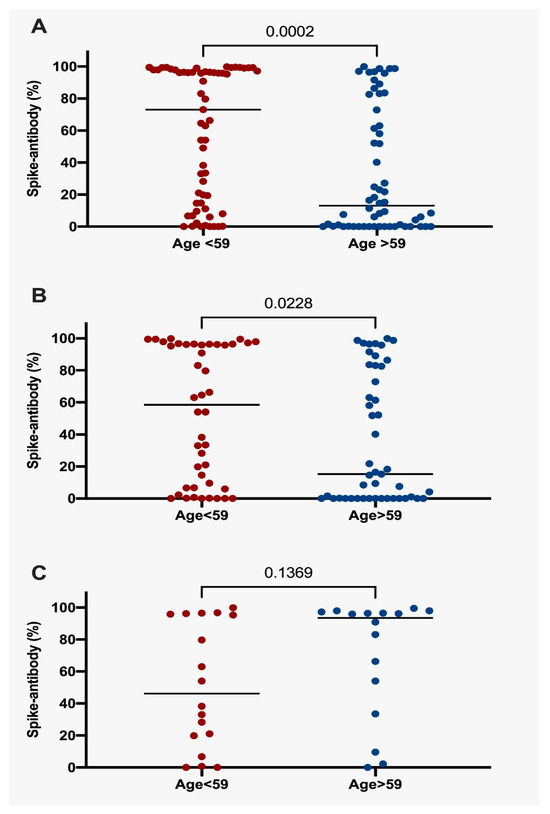 Positivity for SARS-CoV-2 neutralizing antibodies was defined as values over 20% of inhibition. According to this, participants younger than 59 years old produced more antibodies than those older than 59 years (65.9% vs. 43.8%; p = 0.033), harboring a trend to higher titers of antibody production (61% vs. 43.1%; p = 0.098), but without statistical significance (Table 2). As shown in Figure 1A, a greater proportion of subjects younger than 59 years produced antibodies against spike proteins (median 73.8; IQR 84.73) than those older than 59 (median 13.02; IQR 75.35; p = 0.0002). A similar pattern of immune response was exhibited by lung cancer patients, showing that (age < 59 years: median 58.51; IQR 89.64 vs. age > 59 years: median 15.22; IQR 83.06; p = 0.0228) (Figure 1B). Among the lung cancer subgroup, TKI-treated subjects showed no significant differences in antibody production according to age (< 59 years: median 46.12; IQR 79.29 vs. age > 59 years: 93.42; IQR 58.45; p = 0.1369) (Figure 1C). There was a discernible disparity in the levels of neutralizing antibodies among cancer patients when stratified by age, although this factor did not represent a significant modifier of immune response among those TKI treatment (mean = 59 years).