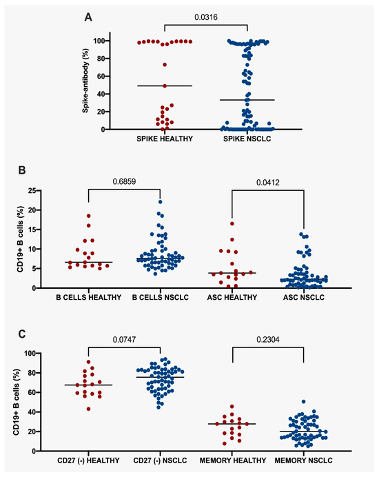Percentage of spike-antibodies between healthy and NSCLC groups. (A) Percentage of spike-antibodies between all healthy and NSCLC patients. (B) Percentage of CD19+ B cells and ASC between healthy and NSCLC groups. (C) CD27(−) and memory CD19+ B cells between healthy and NSCLC groups. Statistical significance: p value ≤ 0.05. NSCLC, Non-Small Cell Lung Cancer. ASC, Antibody-Secreting Cells.
