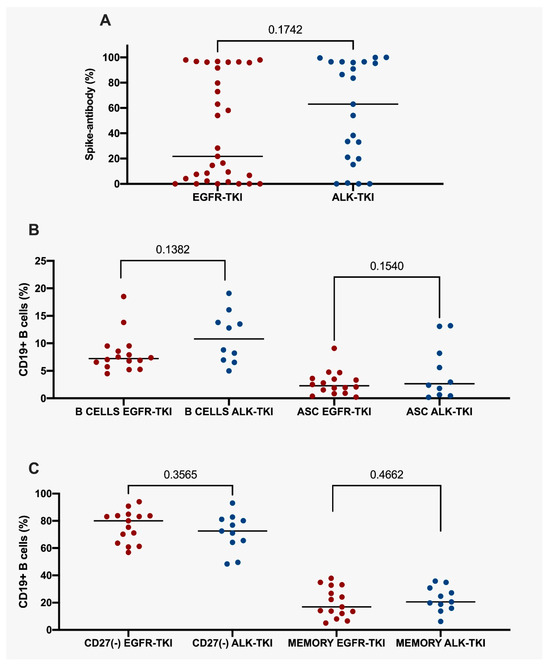Percentage of spike-antibodies in NSCLC harboring EGFR mutations or ALK alterations undergoing tyrosine kinase inhibitors. (A) percentage of spike-antibodies in all NSCLC harboring EGFR mutations or ALK alterations undergoing tyrosine kinase inhibitors. (B) percentage of CD19+ B cells and ASC in NSCLC harboring EGFR mutations or ALK alterations undergoing tyrosine kinase inhibitors. (C) CD27(−) and memory CD19+ B cells in NSCLC harboring EGFR mutations or ALK alterations undergoing tyrosine kinase inhibitors. Statistical significance: p value ≤ 0.05. NSCLC, Non-Small Cell Lung Cancer. ASC, Antibody-Secreting Cells. TKI, tyrosine kinase inhibitors. EGFR, Epidermal Growth Factor Receptor. ALK, anaplastic lymphoma kinase.