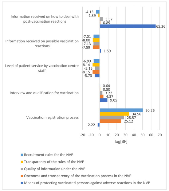 In contrast, age is strongly [logBF 2.3–3.4] associated with the assessment of the level of patient service provided by vaccination centre staff and very strongly [logBF > 3.4] association with the assessment of the history and qualification for vaccination at the vaccination point and the assessment of the information received at the vaccination point about possible post-vaccination reactions. Detailed results of the evaluation of the above elements are presented in