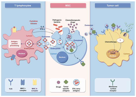 With the orienting properties of MSCs, MSCs and their EVs can deliver anti-tumor drugs to tumor cells, kill tumor cells, and inhibit the invasion of tumor cells. This is because MSCs have different chemotactic-related receptors, orienting to the tumor site and participating in the immune response against tumor cells. Studies have used GPC3+/CD3+ MSCS to induce CD3+ specific T cells to recognize GPC3+ cancer cells. The co-culture of the above three types of cells led to an increase in the production of IFN-γ by specific T cells in the microenvironment, and activated the killing effect of GPC3+ specific cytotoxic T lymphocytes(CTL), which led to the apoptosis of GPC3+ tumor cells. This phenomenon has also been demonstrated in animal studies, which suggest that MSCs are highly suitable for inducing tumor immunotherapy. MSCs have advantages as therapeutic tumor vaccine carriers [66,67].