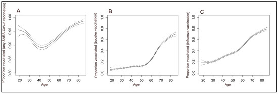 Vaccine uptake by age: (A) any SARS-CoV-2 Vaccination; (B) any SARS-CoV-2 Booster Vaccination; and (C) Influenza Vaccination; (splines model with continuous age; dashed lines present the 95% confidence interval).