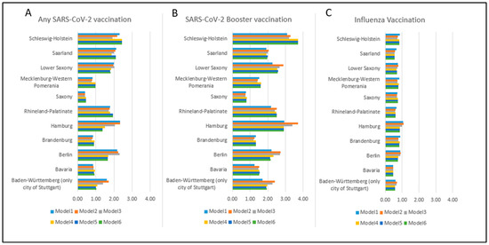 Effects of adjusting for sociodemographic variables on regional variation in vaccine uptake across different federal states in Germany: (A) any SARS-CoV-2 Vaccination; (B) any SARS-CoV-2 Booster Vaccination; and (C) Influenza Vaccination. The odds ratios are presented from logistic regression using Saxony-Anhalt as the reference category. The models progress from Model 1 to 6, each adjusting for an increasing number of variables: (i) Model 1 adjusts for only the federal state; (ii) Model 2 adjusts for the federal state and age; (iii) Model 3 adjusts for the federal state, age, and net equivalent household income; (iv) Model 4 adjusts for the federal state, age, net equivalent household income, and living in a city (>100,000 inhabitants); (v) Model 5 adjusts for the federal state, age, net equivalent household income, living in a city (>100,000 inhabitants), and education; (vi) Model 6 adjusts for the federal state, age, net equivalent household income, living in a city (>100,000 inhabitants), education, and sex. Additionally, the age variable was adjusted with splines.