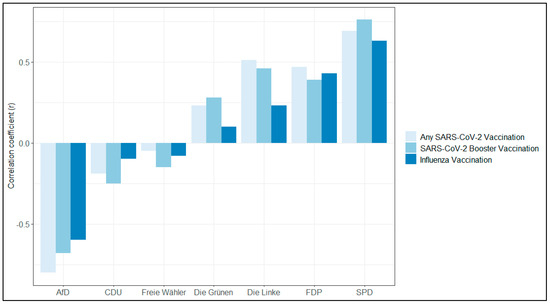 Within the federal states of Saxony and Saxony-Anhalt, similar regional patterns emerged for uptake of COVID-19 and influenza vaccines (Figure 3). Across the seven strongest parties, for three existed positive correlations (Figure 4, with substantial fraction of variation explained, Figure 5), for three rather minor, and for one party a strong negative correlation. The latter is a right-wing party which holds strong anti-vaccination policies.